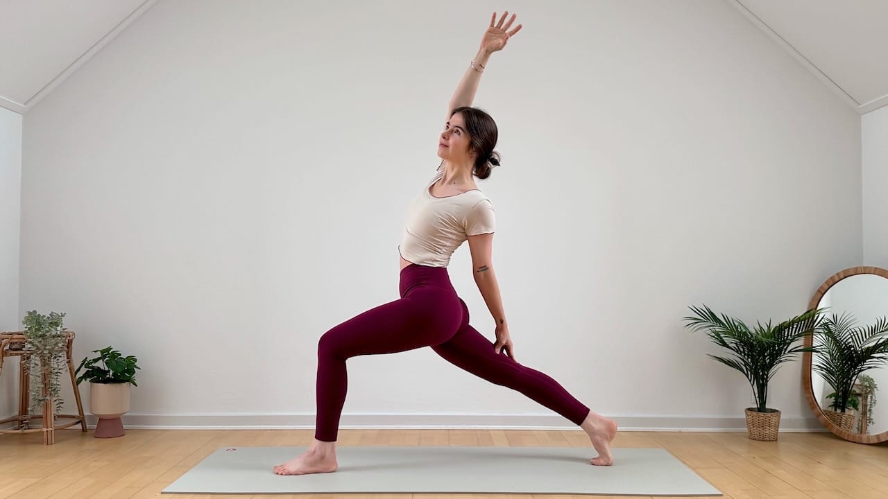 Weitere Haltungen sind unter anderem der dreibeinige Hund, balancierender Vierfüßlerstand, Tiger, High Lunge, Krieger 2, umgekehrtes Dreieck, Seitwinkel und halbes Kamel. Danach kehren wir zum Sitzen zurück und beenden die Einheit mit einer Affirmation.